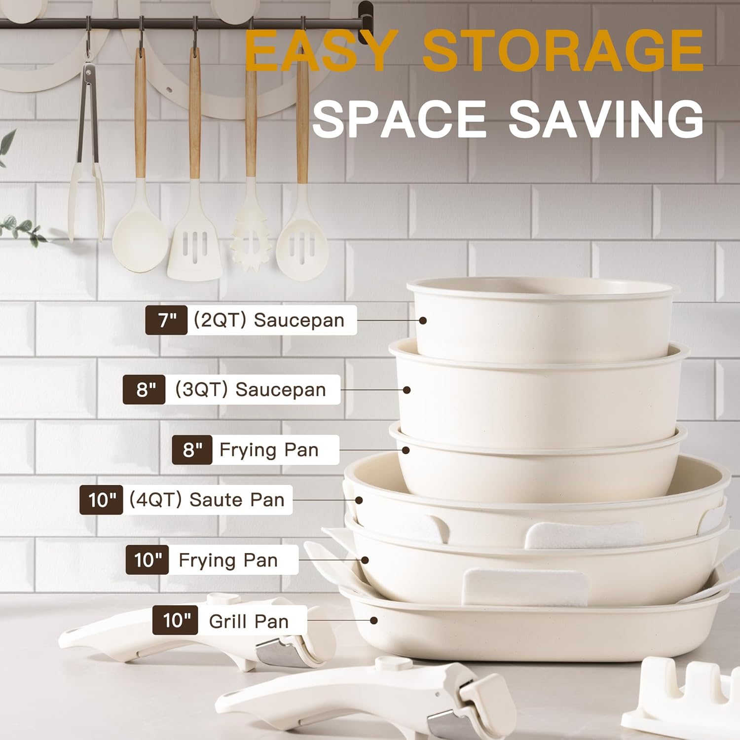 Astercook 23 Pcs Pots and Pans Set Non Stick, Ceramic Cookware Set Detachable Handle, RV Kitchen Cooking Set Removable Handles, Oven Safe, Induction Ready, Stackable Non-stick Set, Cream White