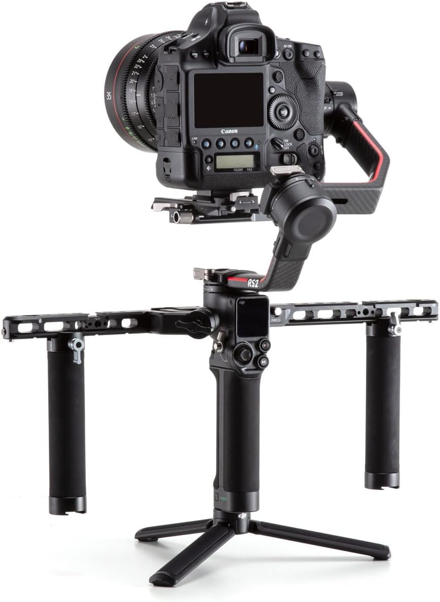 The DJI RS Twist Grip Dual Handle is equipped with NATO ports to enable holding of the gimbal in various configurations, such as with both hands and briefcase mode.