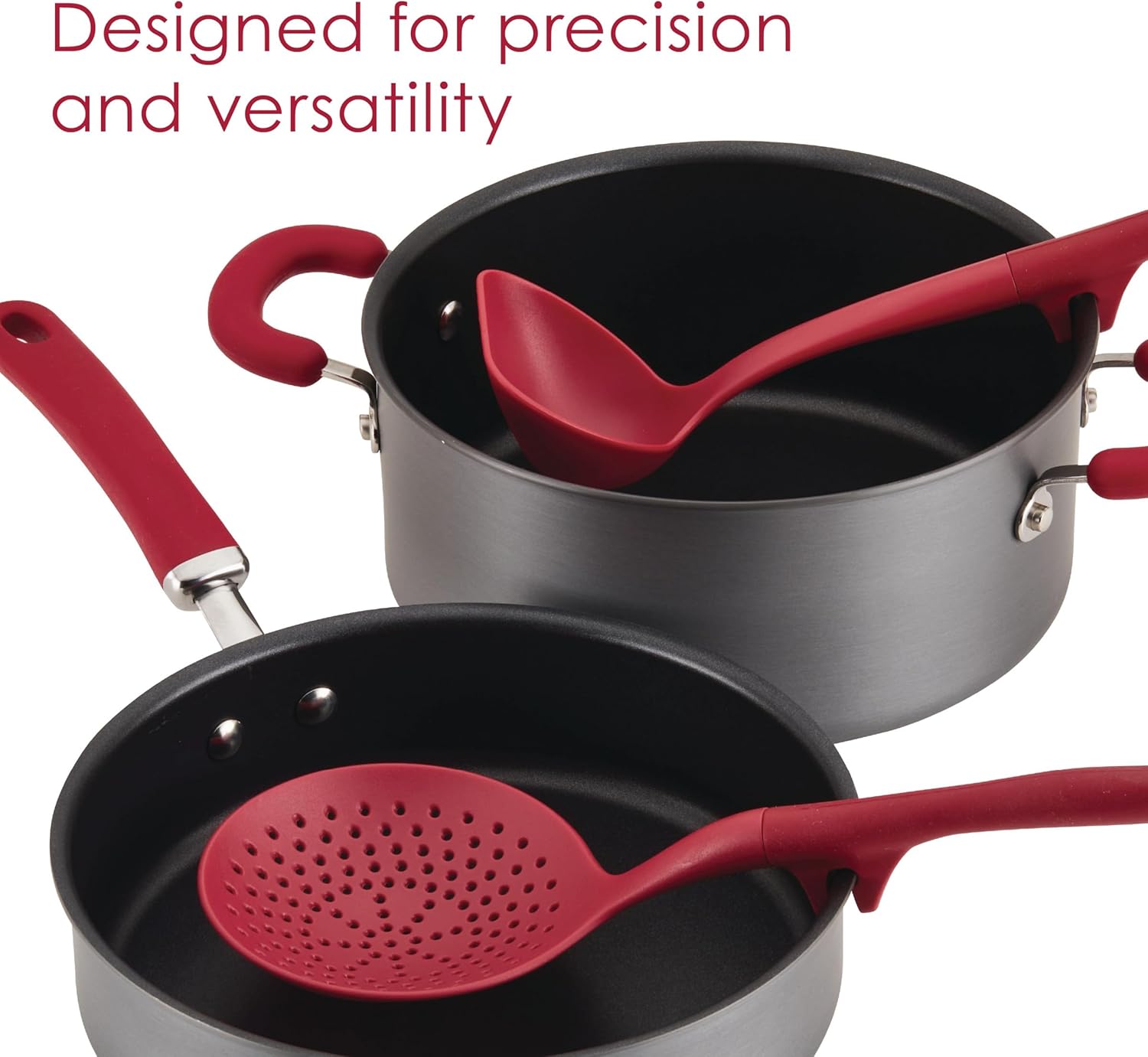 Stir and serve without countertop drips and spills when cooking with Rachael Ray Lazy Tools. Both the past skimmer and ladle in this convenient kitchen utensil set feature notches on the handle to easily rest the kitchen tools on pot and pan rims, reducing mess while cooking and serving. Use the skimmer to easily scoop and strain spoonfuls of spinach and ricotta ravioli or three cheese tortellini. The lazy ladle is perfect for stirring and serving up rich pasta sauce, chicken noodle soup or beef stew. Ideal for cooking with nonstick cookware, these cooking utensils are dishwasher safe for an easy cleanup and heat safe to 400°F.